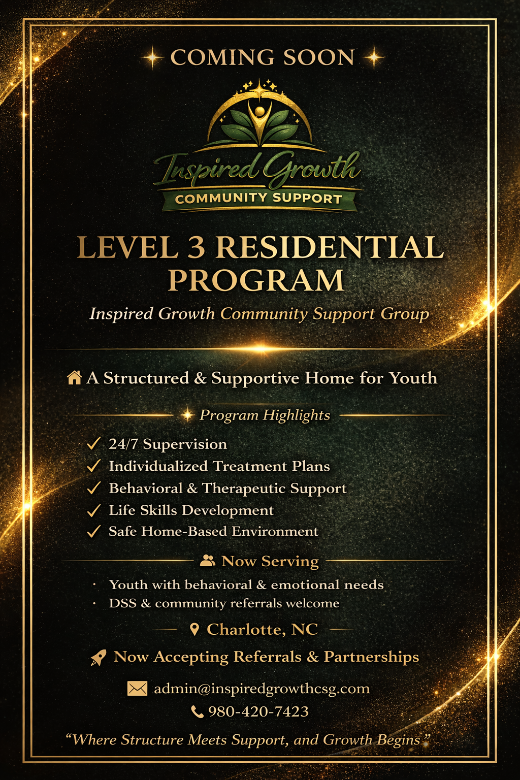 At Inspired Growth Community Support Group, we are excited to announce the upcoming launch of our Level 3 Residential Treatment Program in Charlotte, North Carolina.
